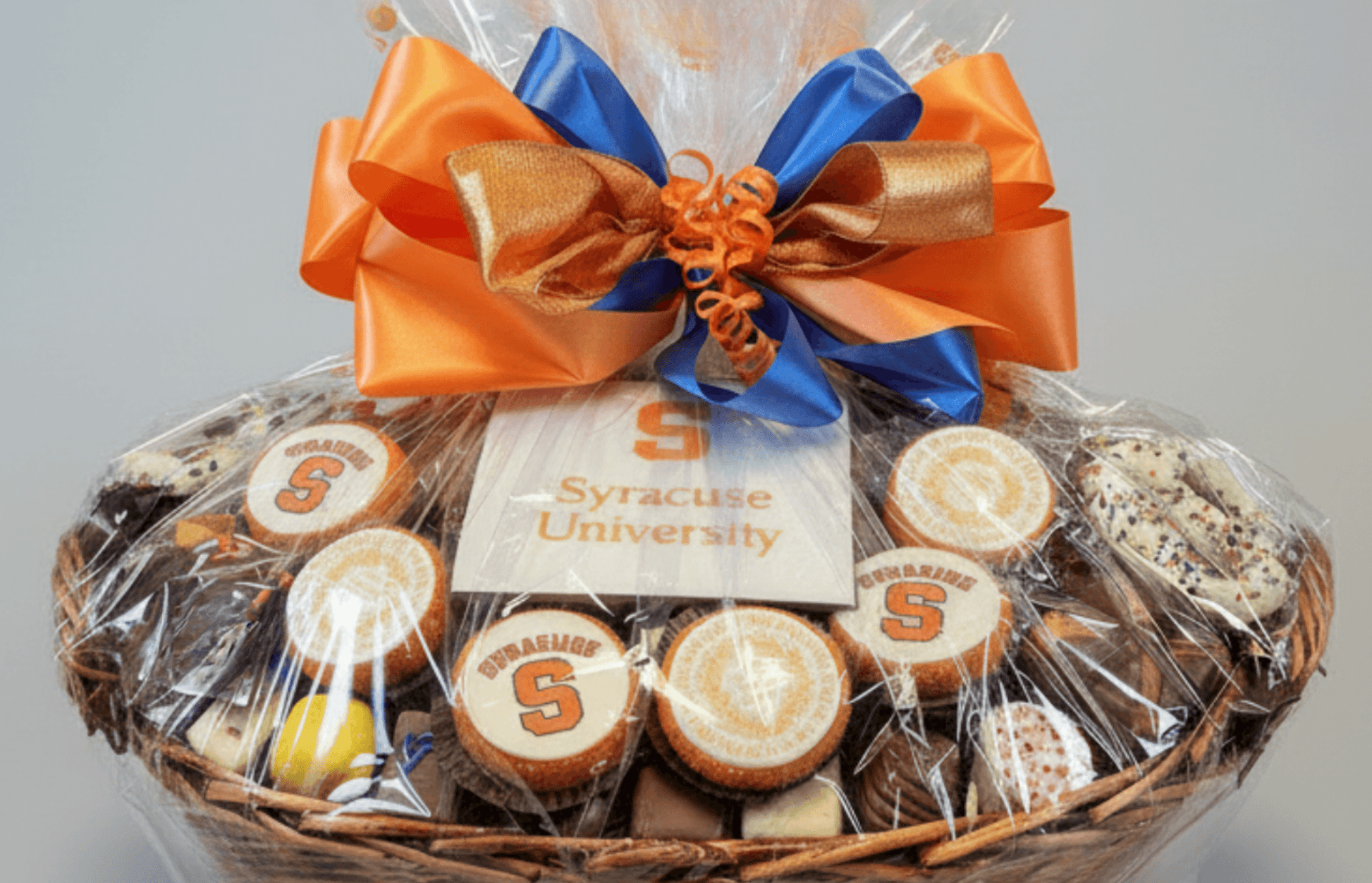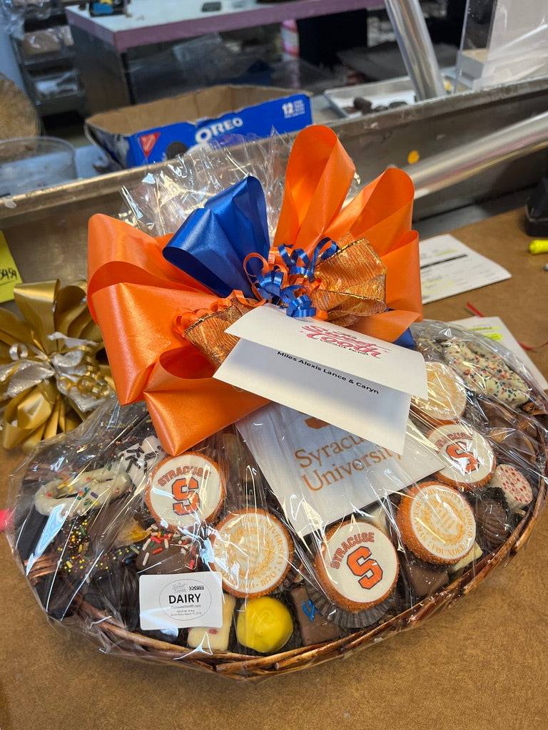 Our College Acceptance Gift Basket is handcrafted in your student's school colors — custom ribbon, wrapping, and an assortment of premium kosher chocolates, truffles, and treats. Made fresh at The Sweet Tooth in North Miami Beach, just like we've done since 1979.